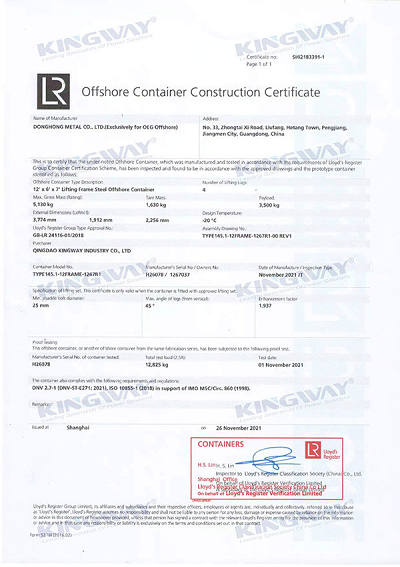 Os contêineres Offshore Kingway são projetados de acordo com os padrões internacionais DNV-ST-E271 (DNV 2.7-1) Contêineres offshore e são reconhecidos por autoridades de certificação, como Lloyd's Register (LR) ou Det Norske Veritas (DNV).